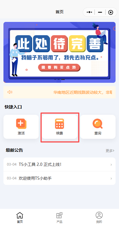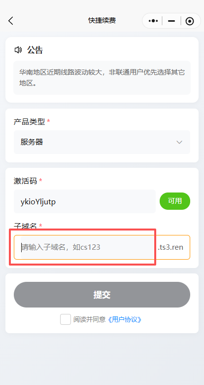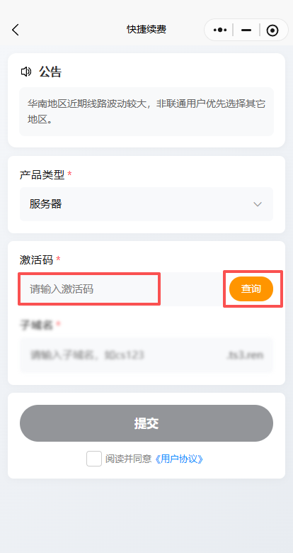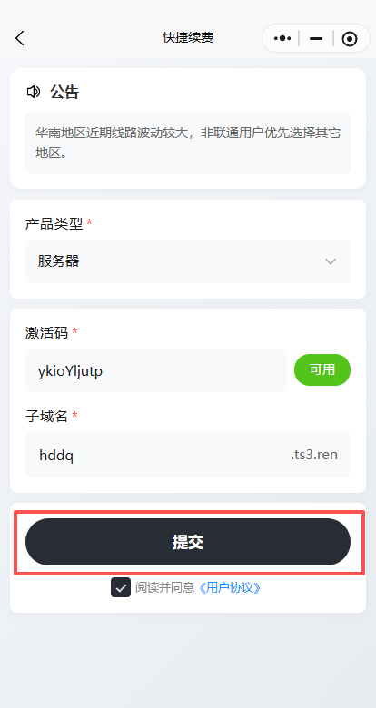 平台使用续费教程本页总览续费教程 教程一共有 3 步 请务必看完 请使用电脑浏览器查看阅读本教程 请不要在微信内直接打开教程! 提示:目前激活卡密和续费卡密通用,下单链接可以混用。 1.微信扫码 打开 激活小程序 如果没有微信,可以发送邮件 kefu@heguyun.com 索要激活网站。 2.选续费 3.输入 激活码 和 子域名 注意!!!子域名处只输前缀,不用输入.ts3.ren 4.点击 提交 提交后没报错就是续费成功啦!