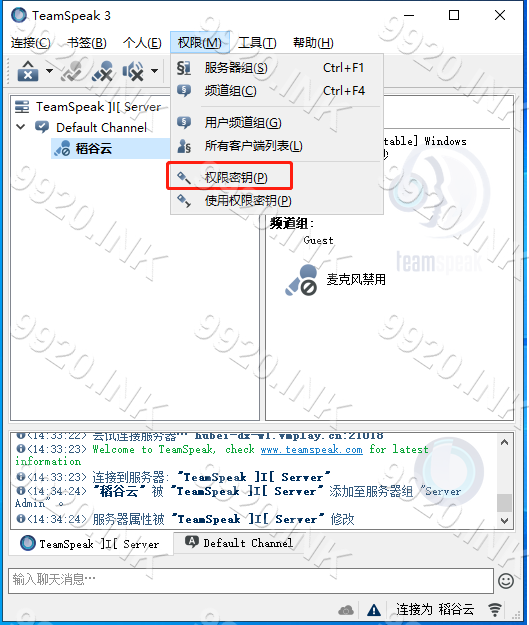 Teamspeak 3 - 客户端教程备份权限密钥本页总览备份权限密钥1.连接服务器 2.依次点击 权限-权限密钥 3.点击创建 4.按照下方选择 Type:服务器组 Group:Server Admin 5.点击 创建 6.复制备份的权限密钥 7.自行保存好刚生成的权限密钥 注意:每个权限密钥只能使用一次,可以生成保存多个权限密钥。 8.本章节教程结束!