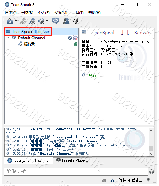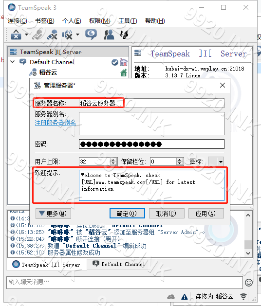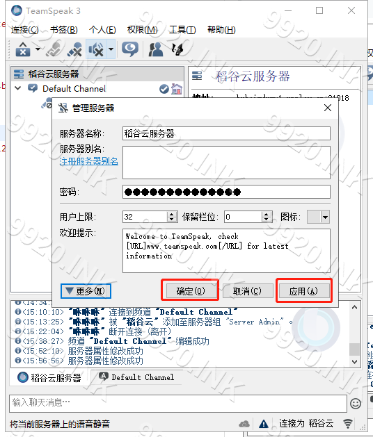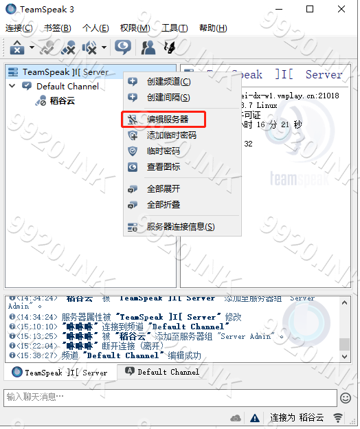 Teamspeak 3 - 客户端教程修改服务器信息本页总览修改服务器信息1.右键服务器 如需设置 频道信息 同理 2.点击 编辑服务器 3.输入你要修改的服务器信息 4.先点击 应用保存 再点击 确定 退出 5.本章教程结束!
