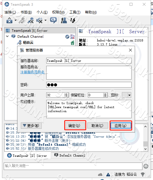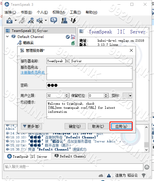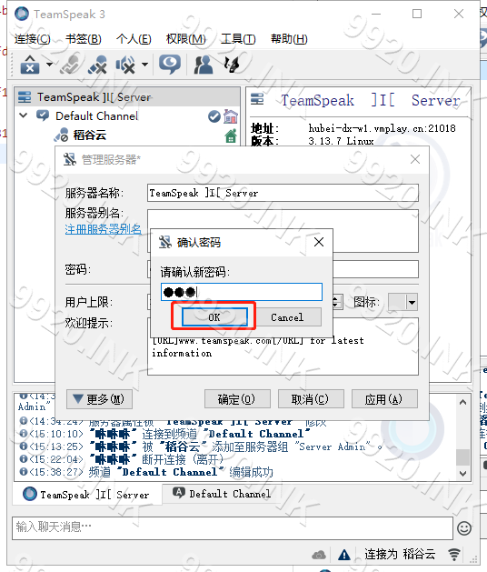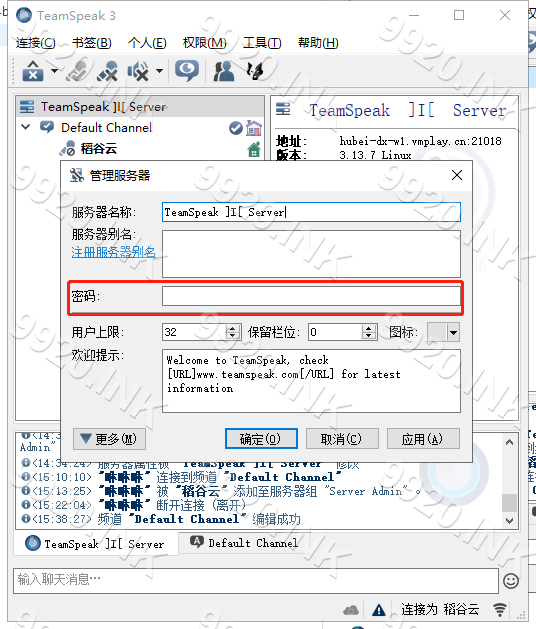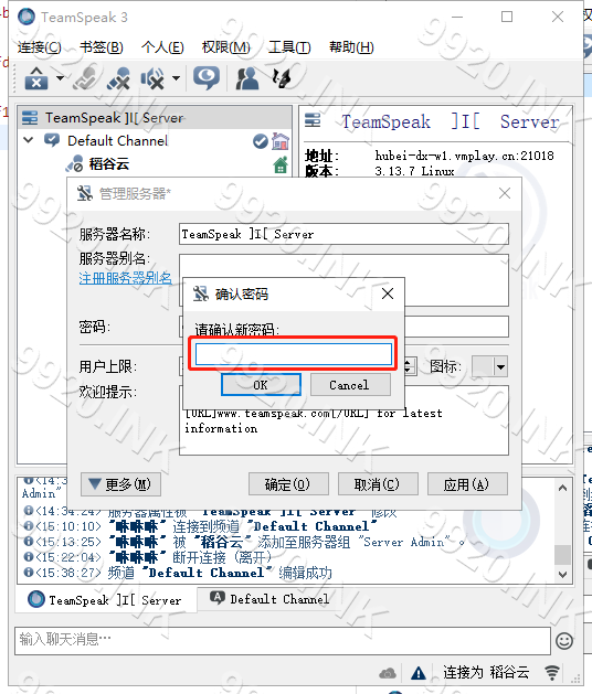 Teamspeak 3 - 客户端教程设置服务器密码本页总览设置服务器密码1.右键服务器 如需设置 频道密码 同理 2.点击 编辑服务器 3.在此处输入你要设置的服务器密码 4.点击 应用 5.再输入一次刚设置的服务器密码 6.点击 OK 7.先点击 应用保存 再点击 确定 退出 8.本章节教程结束!