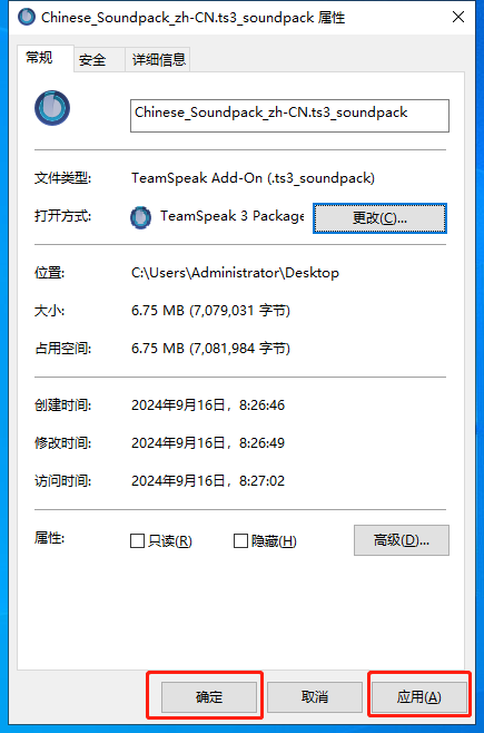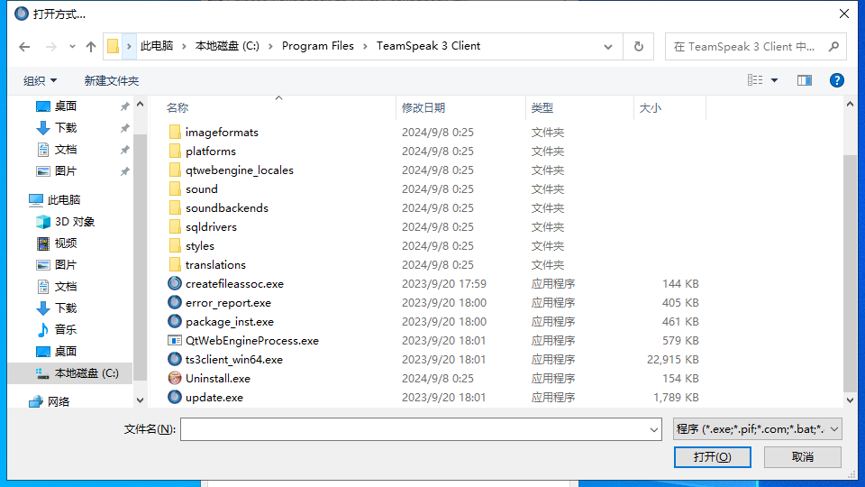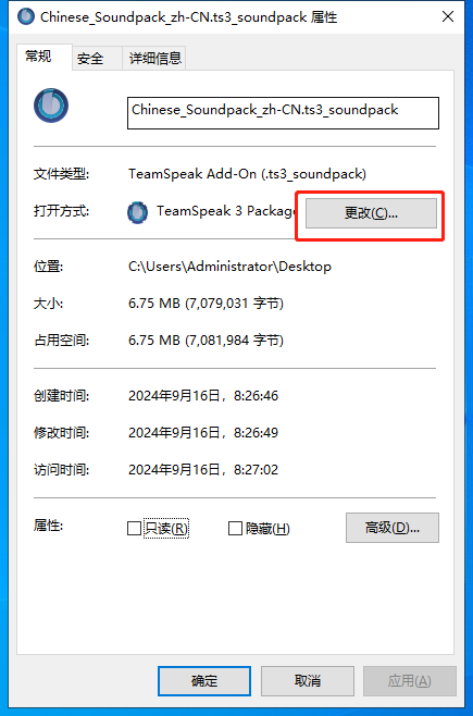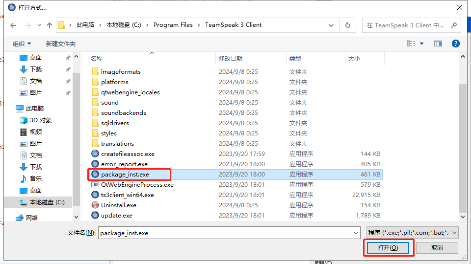 Teamspeak 3 - 客户端教程常见问题语音包打不开本页总览语音包打不开1.右键 汉化包或语音包 点击 属性 2.打开方式 点击 更改 3.点击 更多应用(如果有) 4.点击 在这台电脑上选择其它应用 5.找到安装TS的文件夹 按照你当初选择的路径为准,如果没选就是默认路径 默认路径:C:\Program Files\TeamSpeak 3 Client 6.选择 "package_inst.exe" 7.点击 应用 并 确定 8.重新 打开汉化包或语音包 即可 9.本章教程结束!