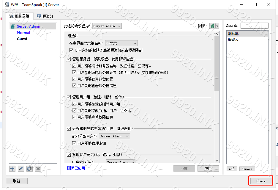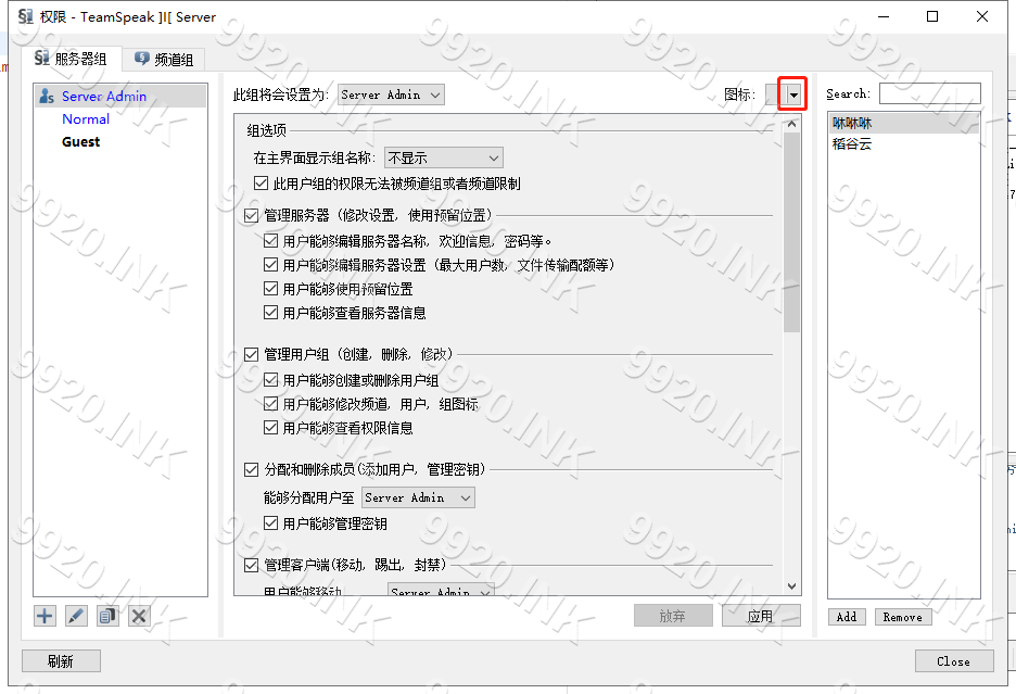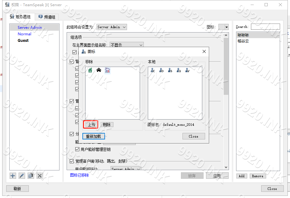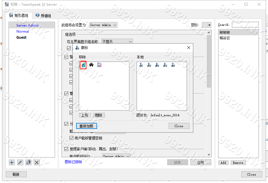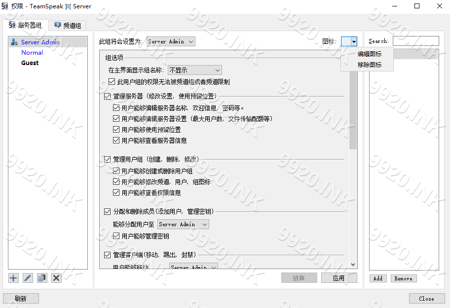 Teamspeak 3 - 客户端教程美化教程修改权限图标本页总览修改权限图标权限图标展示: 1.依次点击 权限-服务器组 2.点击 图标 隔壁小箭头 3.点击 编辑图标 4.上传所需图标 注意:图标大小 仅支持 8KB大小 以下 5.双击选择图标 6.点击 Close 返回 7.修改完成 8.本章教程结束!