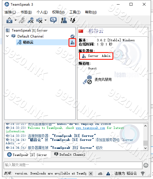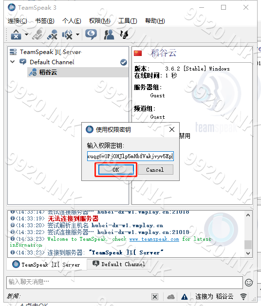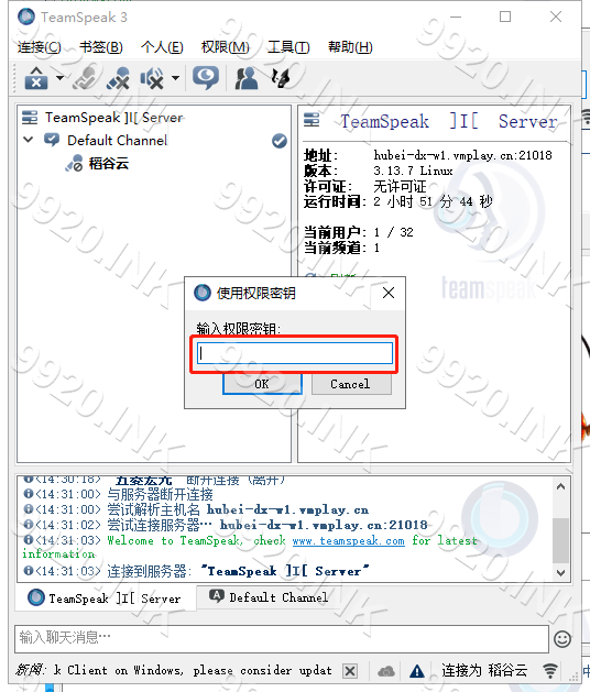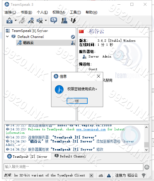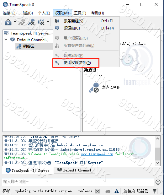Teamspeak 3 - 客户端教程使用权限密钥本页总览使用权限密钥强烈建议在使用权限密钥后备份权限密钥 1.连接服务器 2.依次点击 权限-使用权限密钥 3.输入 权限密钥 4.点击OK 5.使用成功 6.检查是否成功获得 管理员权限 7.本章教程结束!