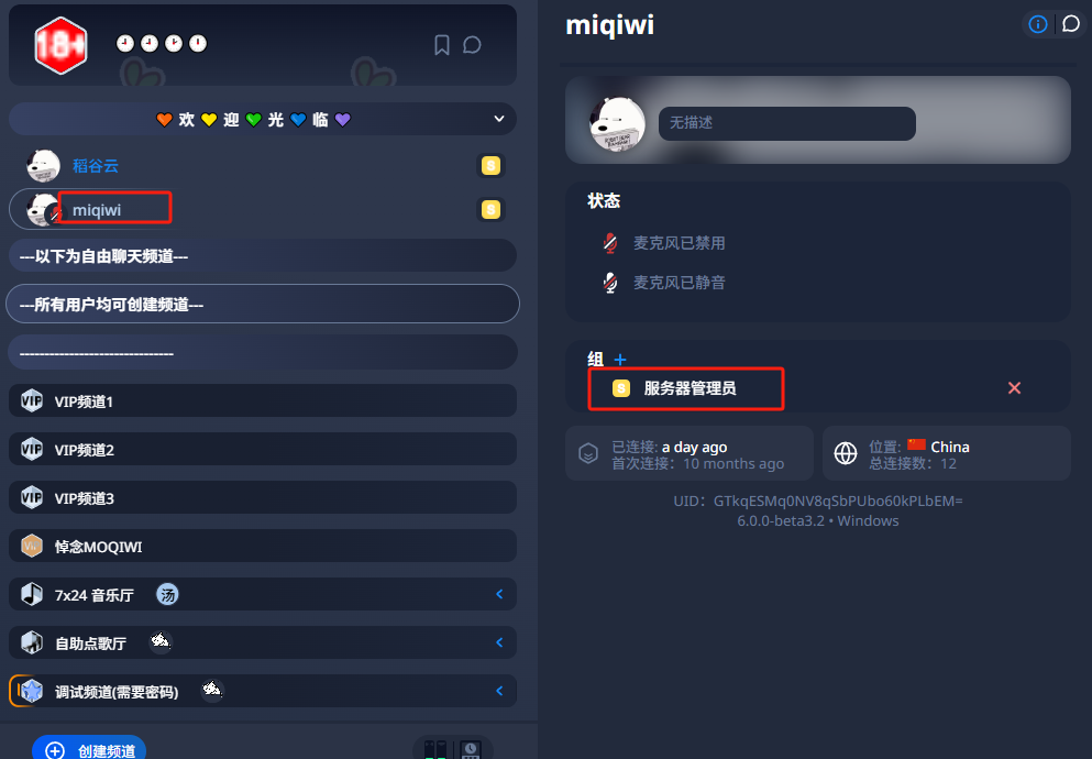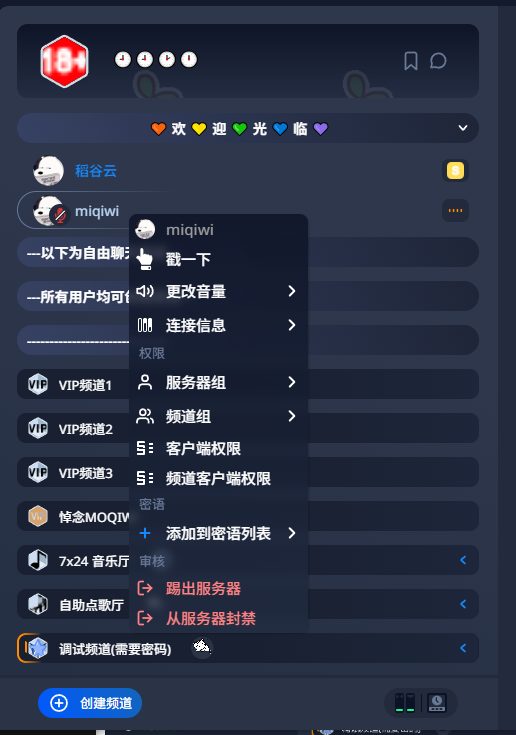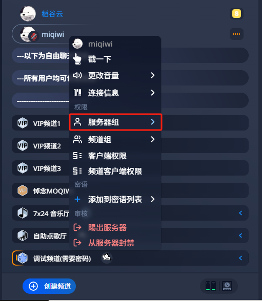 Teamspeak 6 - 客户端教程赋予他人权限本页总览赋予他人权限小贴士问:为什么我修改不了?答:因为你没有修改权限,请检查自己是否有Server Admin权限,检查方法 《点我查看》 。 1.连接服务器 2.右键 需要给权限的用户 3.依次选择 服务器组-Server Admin 4.检查对方否成功获得 管理员权限 5.本章教程结束!
