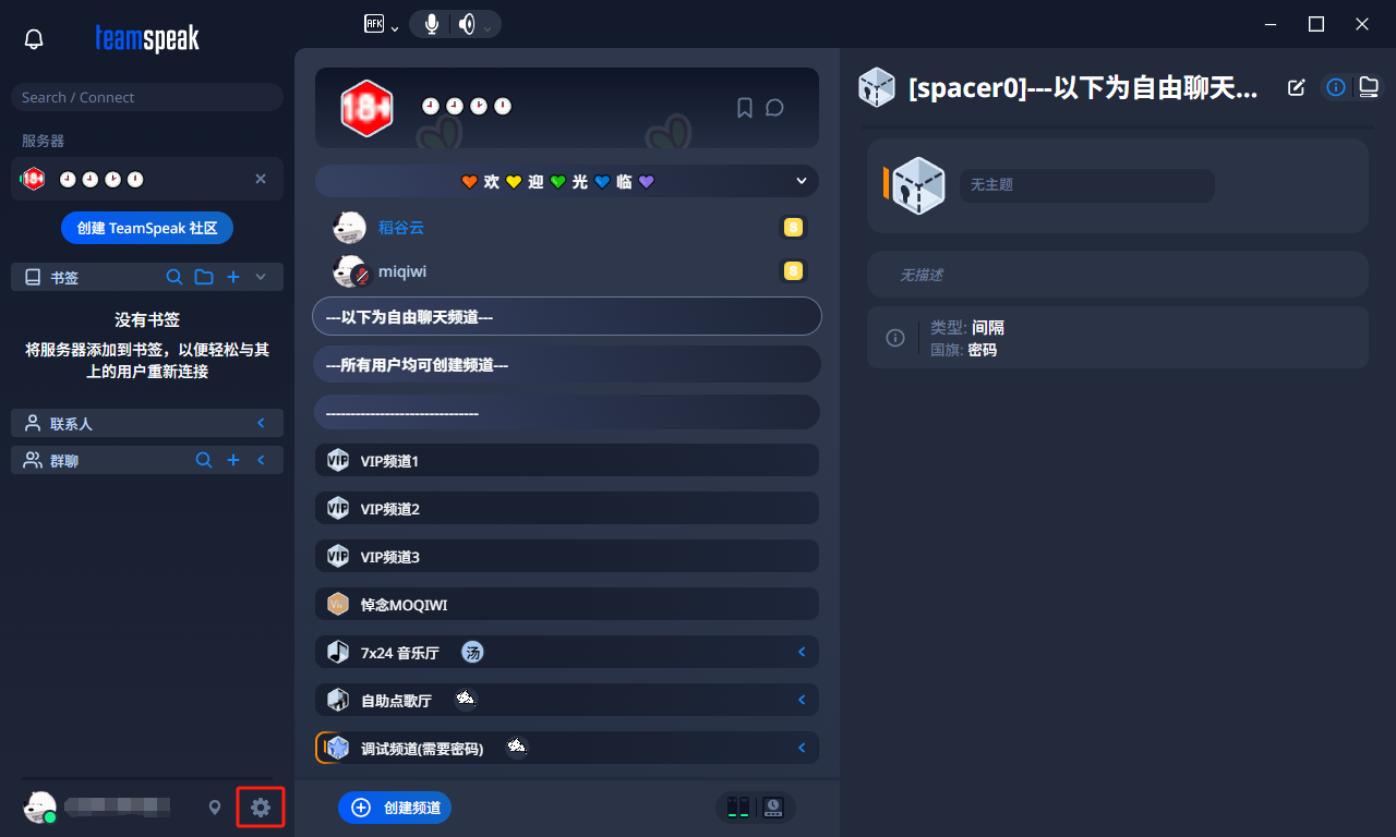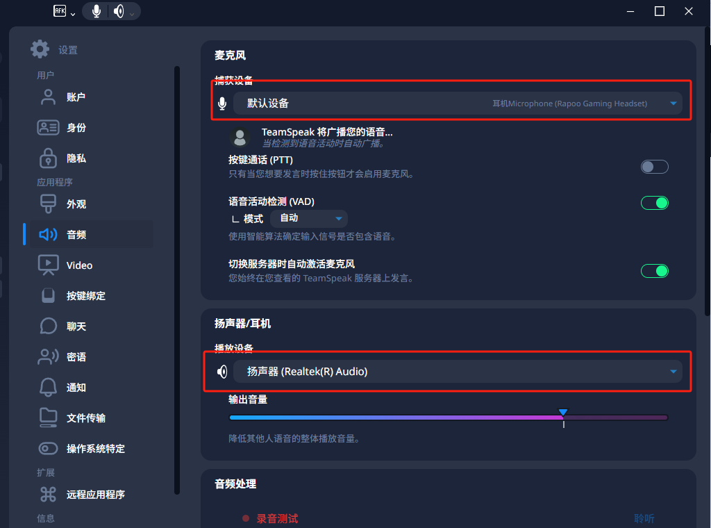 Teamspeak 6 - 客户端教程输入输出设置本页总览输入输出设置1.连接服务器 2.点击 左下角齿轮(设置) 3.点击左边 音频 4.修改 捕获设备 和 扬声器/耳机 常见问题 问题主要问题解决方法别人都听不见你发言你麦克风设备问题确保麦克风设备没问题,调整捕获设备直到正常你听不见其它人发言你扬声器设备问题确保扬声器设备没问题,调整扬声器/耳机设备直到正常万能测试方法音频处理-录音测试先录制声音再点击播放,有问题就调整设备,直到解决 万能测试方法-位置图示 捕获设备/扬声器/耳机设备-位置图示 5.设置完成后 返回即可 6.本章教程结束!
