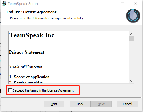 Teamspeak 6 - 客户端教程安装客户端本页总览安装客户端客户端 下载地址:点我打开 1.双击打开下载好的安装包 注意文件名,别打开错了。 2.点击 下一步 3.同意协议 4.点击 下一步 5.点击 下一步 6.点击 安装 选择是否创建快捷方式(建议勾选) 7.等待安装 8.安装完成! 10.本章教程结束!