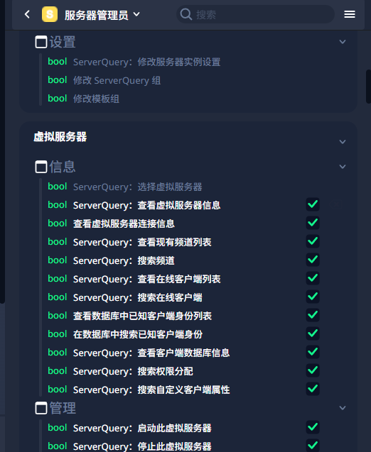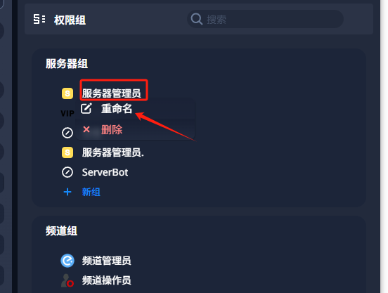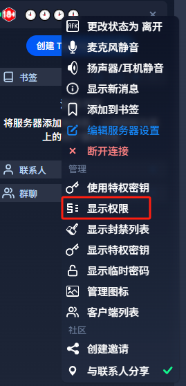 Teamspeak 6 - 客户端教程修改权限组信息本页总览修改权限组信息小贴士问:为什么我修改不了?答:因为你没有修改权限,请检查自己是否有Server Admin权限,检查方法 《点我查看》 。 1.连接服务器 2.右键服务器 3.点击 “显示权限” 4.功能详解 修改名称 右键需要修改的名称---点击“重命名” 修改权限 危险行为修改权限划分可能导致权限丢失,严重时可能需要重置才能恢复。 点击需要修改“权限组” 修改权限 5.本章教程结束!