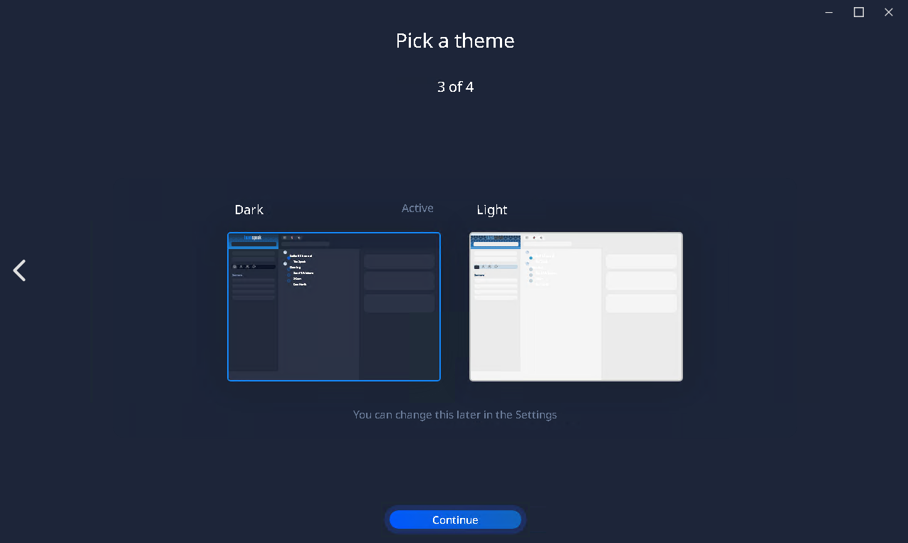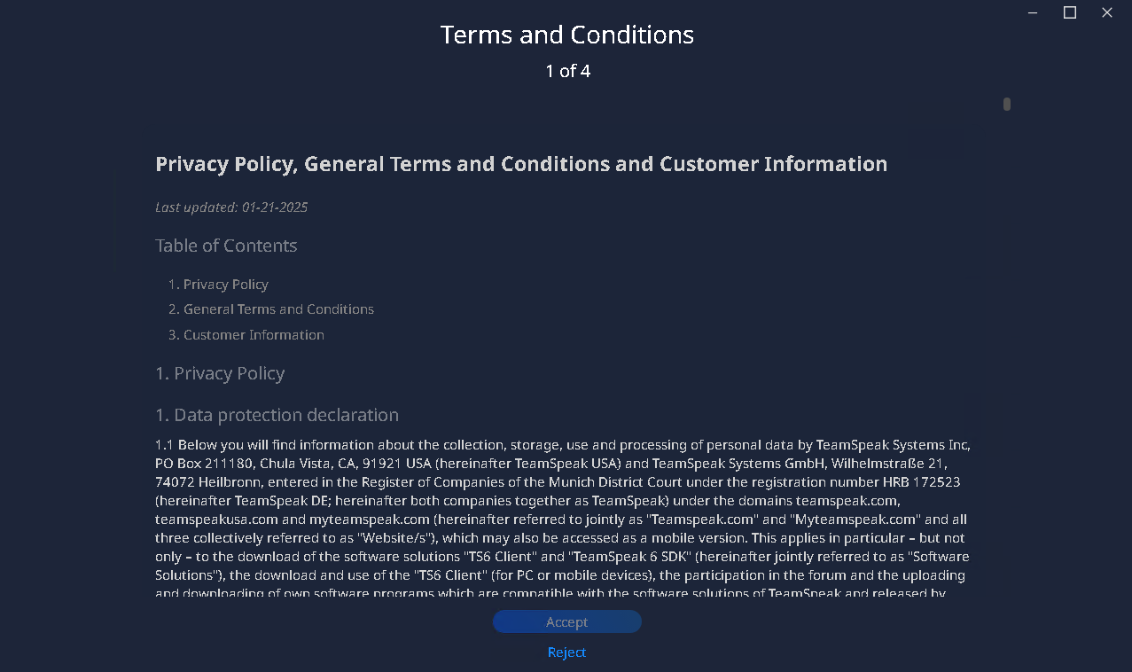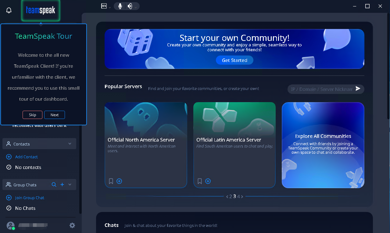Teamspeak 6 - 客户端教程启动客户端本页总览启动客户端1.双击打开安装好的客户端 注意文件名,别打开错了。 2.点击 开始使用 3.同意 用户协议 拉到最底下,点击Accept 4.登录自己账号 没有自己账号?点我注册 5.按自己喜好选择 深色模式 或 浅色模式 6.点击完成设置 7.点击 Skip 跳过引导 8.点击 Skip 跳过引导 6.本章教程结束!